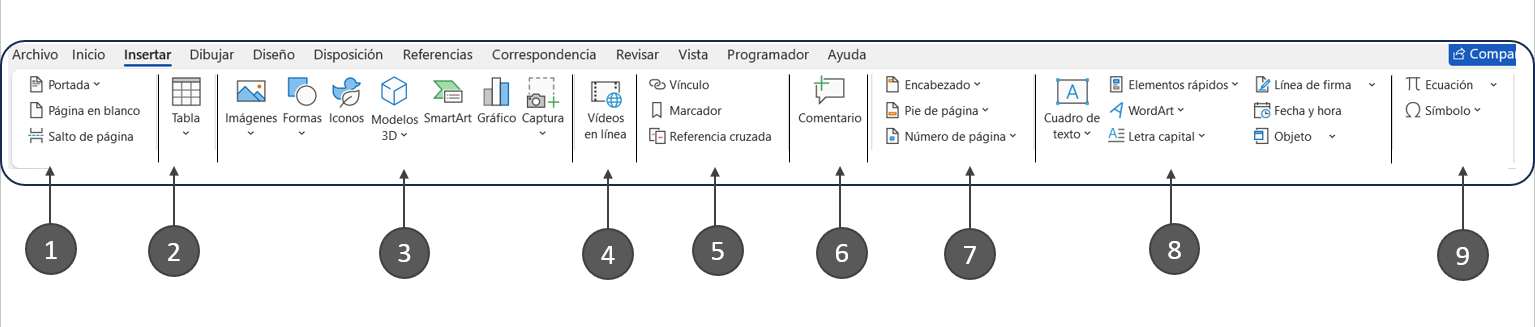 15. En la pestaña Insertar, ¿Cómo se llama el bloque indicado con el número 9?