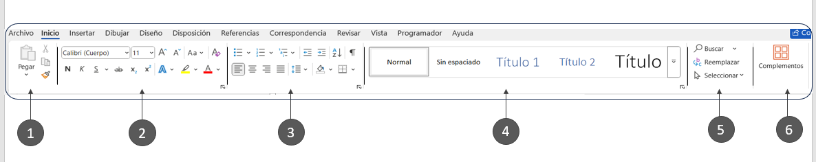 6. En la pestaña Inicio, ¿Cómo se llama el bloque indicado con el número 6?