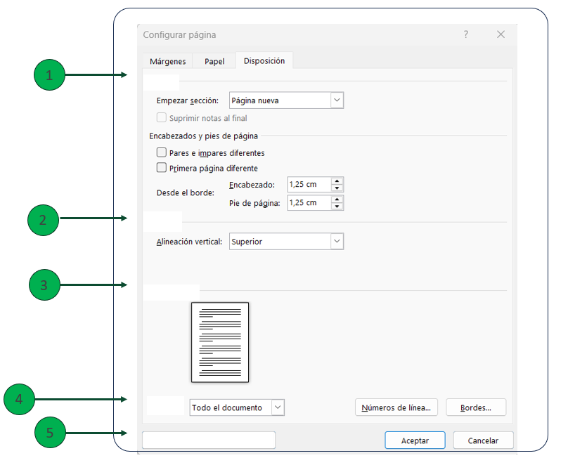 1. En el cuadro de diálogo Configurar página, en la pestaña Disposición indica el nombre de la opción señalada con un 6