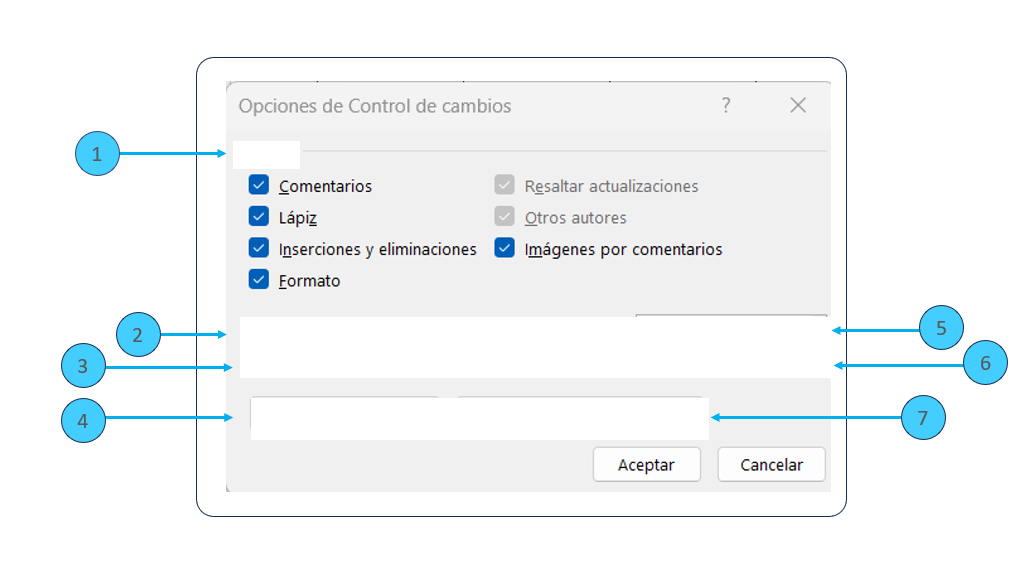 5. En el cuadro de diálogo Revisión, en la pestaña Opciones de Control de cambios indica el nombre de la opción señalada con un 2