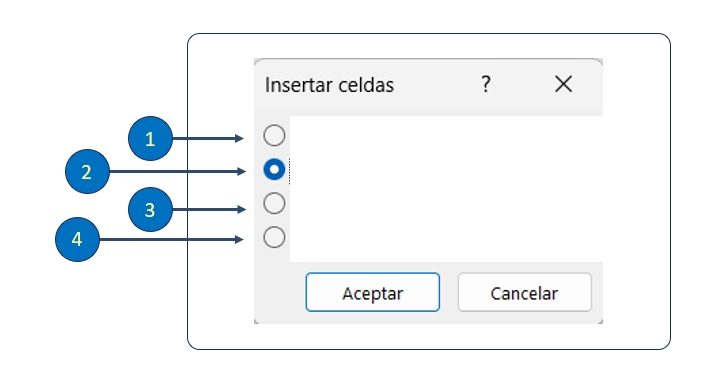 12. En el cuadro de diálogo Filas y columnas,en la pestaña Insertar celdas indica el nombre de la opción señalada con un 4