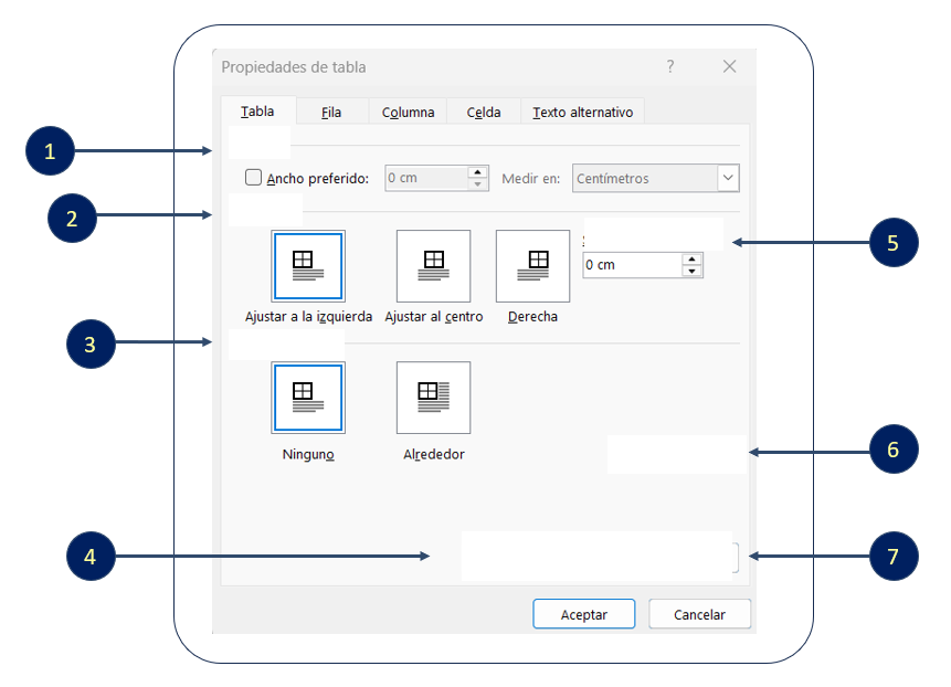 19. En el cuadro de diálogo Tamaño de celda, en la pestaña Propiedades de tabla opción Tabla indica el nombre de la opción señalada con un 7