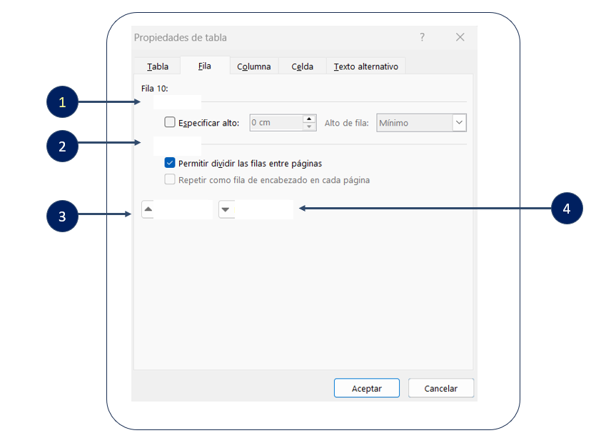 20. En el cuadro de diálogo Tamaño de celda, en la pestaña Propiedades de tabla opción Fila indica el nombre de la opción señalada con un 1